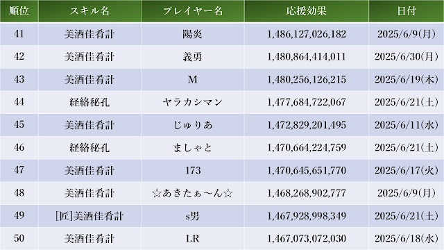 【第五十六回】炎舞の瓦版 7/17/2025 <炎舞の瓦版> 皆様、こんにちは!第五十六回目の「炎舞の瓦版」をお届けいたします。今回も月間ダメージと応援効果のTOP100、そして新進気鋭のプレイヤー様をご紹介していきます!■月間ダメージと応援効果TOP100について・Aランク以上の連合に所属していたプレイヤー様を対象としております。・特殊文字が含まれている場合は正常に反映されていない場合がございます。・不適切なお名前であると判断した場合は一部修正して掲載されることがあります。・各ランキングは従来の全体スキルランキング形式でご紹介しています。▼ダメージランキング 敬称略 ▼応援ランキング 敬称略 前月中に新たに「真 戦国炎舞 -KIZNA-」のアカウントを作成された方の中から、前衛・後衛デッキどちらかの総戦力が高い方をランキング形式でご紹介します。※敬称略 X (旧Twitter) LINE